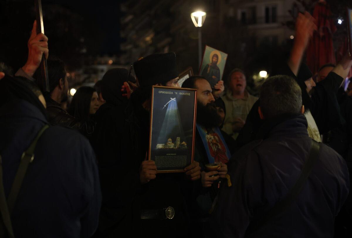 Συγκεκριμένα, σε σημείο πλησίον του Λευκού Πύργου συγκεντρώθηκαν άτομα με σταυρούς και εικόνες στα χέρια, φωνάζοντας συνθήματα κατά της παράστασης, σύμφωνα με το typothes.gr.