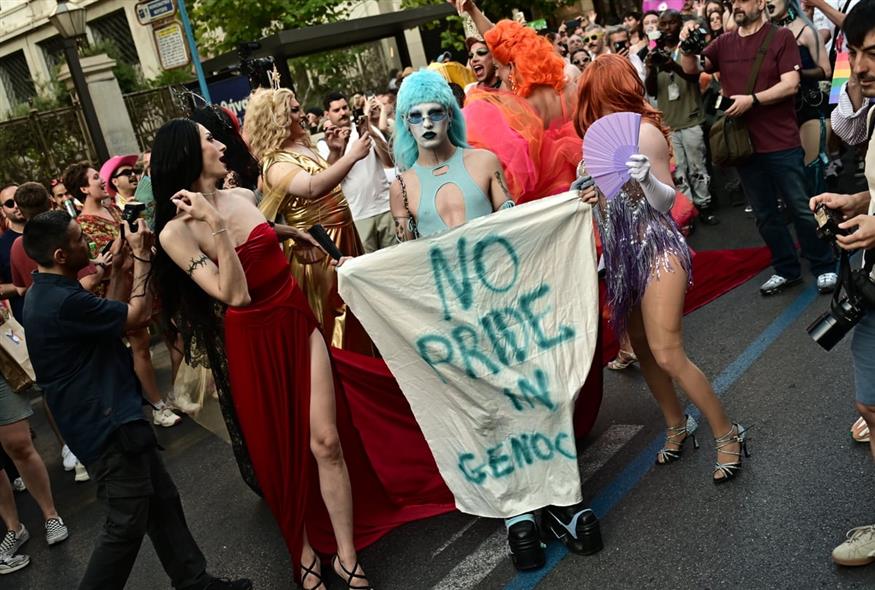 Ανάμεσα στα πανό και σημαιάκια με το χαρακτηριστικό ουράνιο τόξο ξεχώρισαν και αρκετά πανό με συνθήματα υπέρ του λαού της Γάζας, που από την 7η Οκτωβρίου βομβαρδίζεται αδιαλείπτως από το Ισραήλ.