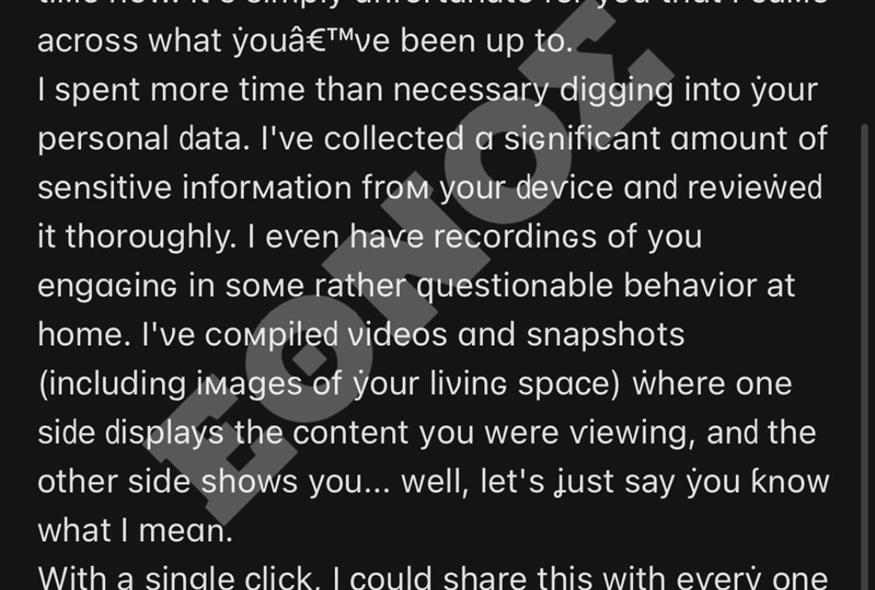 «Παρακολουθώ τις δραστηριότητες σου εδώ και αρκετό καιρό. Είσαι πολύ άτυχος που βρήκα τι κάνεις. Πέρασα αρκετό χρόνο ψάχνοντας τα προσωπικά σου δεδομένα. Έχω συλλέξει έναν σεβαστό όγκο ευαίσθητων πληροφοριών από την συσκευή σου και τις έχω μελετήσει επισταμένα. Έχω βίντεο της ιδιαίτερα περίεργης συμπεριφοράς σου στο σπίτι. Έχω μαζέψει βίντεο και στιγμιότυπα οθόνης (συμπεριλαμβανομένων εικόνων του σπιτιού σου) όπου στη μία μεριά φαίνεται το περιεχόμενο που έβλεπες και στην άλλη μεριά φαίνεσαι εσύ... ας πούμε ότι ξέρεις τι εννοώ. Με ένα κλικ, μπορώ να τα στείλω σε όλες σου τις επαφές», αναφέρει ο αποστολέας της νέας ηλεκτρονικής εκβιαστικής απάτης στο επίμαχο mail.