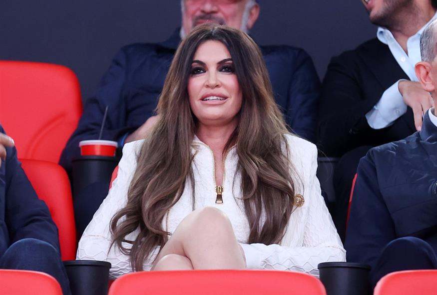 Ο φωτογραφικός φακός την «έπιασε» να κάθεται ανάμεσα στους αδερφούς Αγγελόπουλους, παρακολουθώντας και την προθέρμανση των δύο ομάδων.