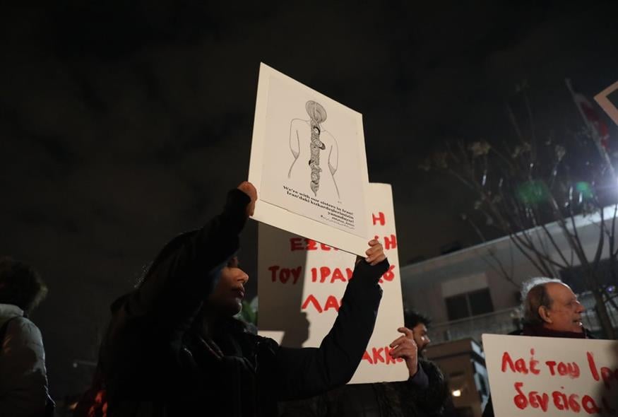 Συγκέντρωση έξω από την πρεσβεία του Ιράν στο Ψυχικό πραγματοποίησαν Ιρανοί που ζουν στην Ελλάδα, καθώς και Έλληνες αλληλέγγυοι.