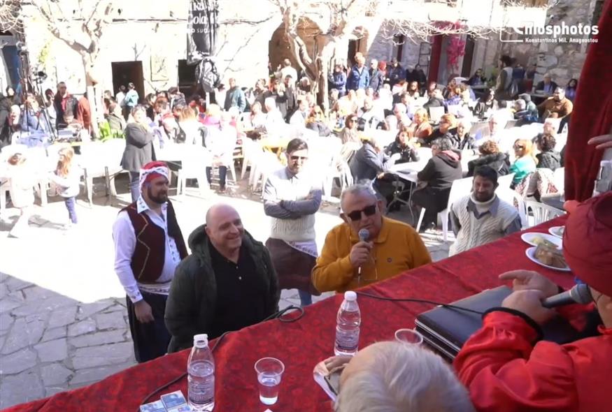 Τότε, ένας κάτοικος που το βρήκε επίσης αστείο, πήρε το μικρόφωνο και είπε «σήμερα κάνουμε ένα παλιό έθιμο και κάνουμε πλάκα. Αν σας ενοχλεί μπορείτε να φύγετε και να μην ξανάρθετε εδώ». Με κάποιους... φυσικά να χειροκροτούν.