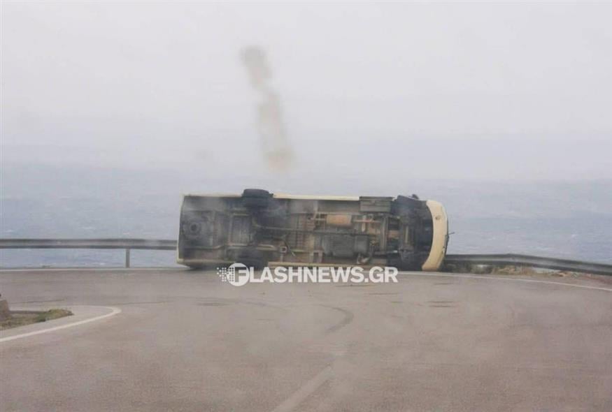 Χανιά: Ανετράπη λεωφορείο την ώρα που ο αέρας σήκωνε πέτρες στα Σφακιά