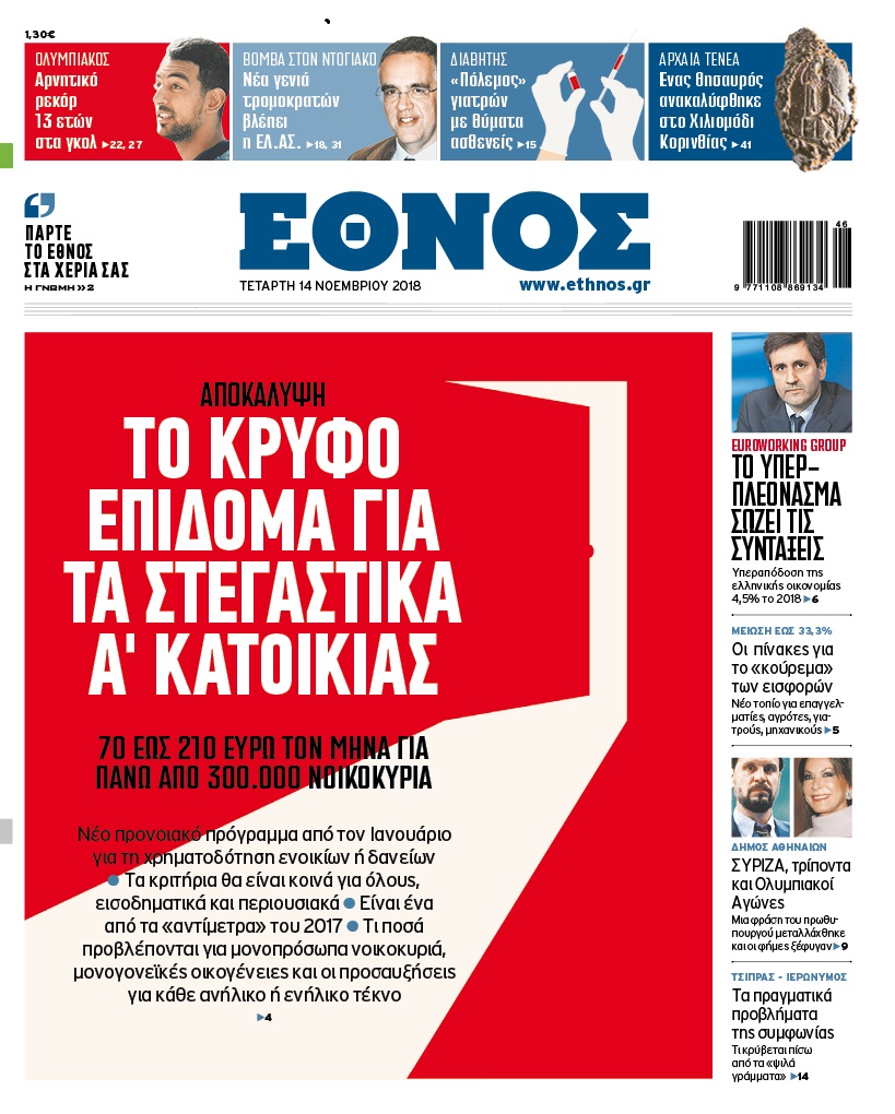 Διαβάστε στο ΕΘΝΟΣ που κυκλοφορεί την Τετάρτη 14/11/2018