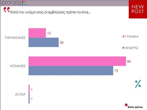 Παράλληλα το 84% των γυναικών (ερωτώμενων) απαντάει ότι πρέπει να είναι νόμιμες οι αμβλώσεις ενώ υπέρ τάσσεται το 73% (άντρες ερωτώμενοι). Παράλληλα το 87% (άνω των 55 ετών) σημειώνει ότι πρέπει να είναι νόμιμες ενώ το 74% 18-34) και το 73% (35-54) τάσσεται υπέρ της νομιμότητας των αμβλώσεων. Αντιθέτως το 19% των ερωτηθέντων με πανεπιστημιακή μόρφωση απαντάει ότι πρέπει να είναι παράνομες, ενώ το 25% με μη πανεπιστημιακή μόρφωση απαντάει το ίδιο. Επιπλέον το 80% των ερωτηθέντων με πανεπιστημιακή μόρφωση τάσσεται υπερ της νομιμότητας, ενώ το ίδιο απαντάει το 73% με μη πανεπιστημιακή μόρφωση απαντάει το ίδιο.