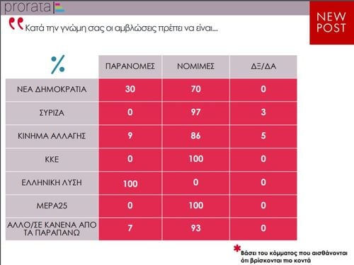 Τέλος το 70% των ερωτηθέντων που είναι ψηφοφόροι της Νέας Δημοκρατίας θεωρούν ότι πρέπει να είναι νόμιμες ενώ το 30% θεωρεί ότι πρέπει να είναι παράνομες. Το 97% των ψηφοφόρων του ΣΥΡΙΖΑ τάσσονται υπερ της νομιμότητας, το 86% των ψηφοφόρων του ΚΙΝΑΛ απαντούν ότι πρέπει να είναι νόμιμες, ενώ το 9% ότι πρέπει να είναι παράνομες. Το 100% των ψηφοφόρων του ΚΚΕ τάσσονται υπερ της νομιμότητας. Το ίδιο και οι ψηφοφόροι του ΜέΡΑ25. Όσον αφορά τους ψηφοφόρους της Ελληνικής Λύσης το 100% απαντάει ότι πρέπει να είναι παράνομες.