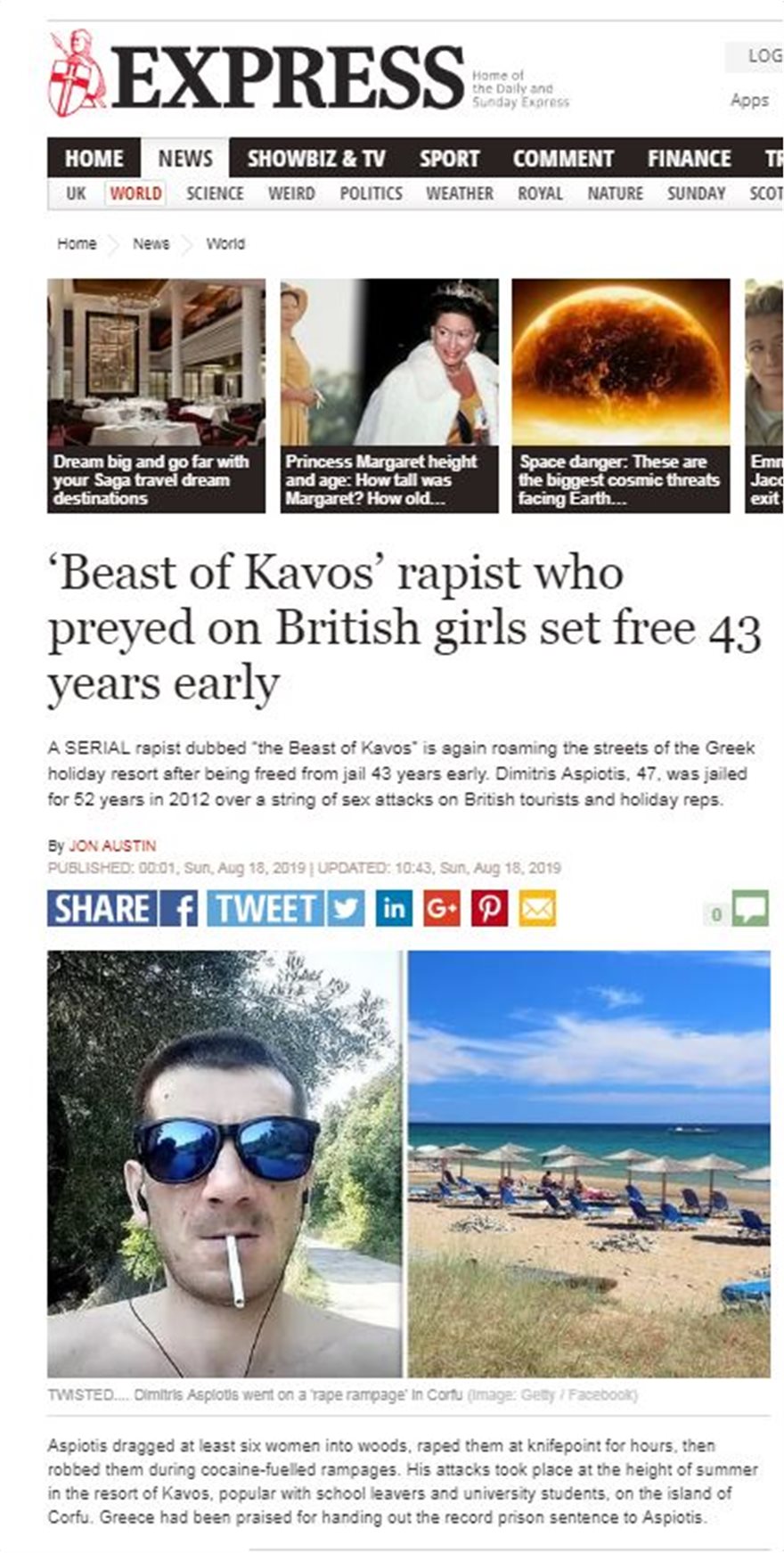 Σάλος έχει ξεσπάσει σε βρετανικά ΜΜΕ από την είδηση ότι ένας κατά συρροή βιαστής τουριστριών από τη Βρετανία στην Κέρκυρα και συγκεκριμένα στον Κάβο, που είχε καταδικαστεί σε 52 χρόνια κάθειρξη, αφέθηκε ελεύθερος. Ο Δημήτρης Ασπιώτης είχε επιτεθεί σε τουλάχιστον έξι γυναίκες, τις οποίες είχε παρασύρει -υπό την απειλή μαχαιριού, σε δάσος- όπου τις βίασε.