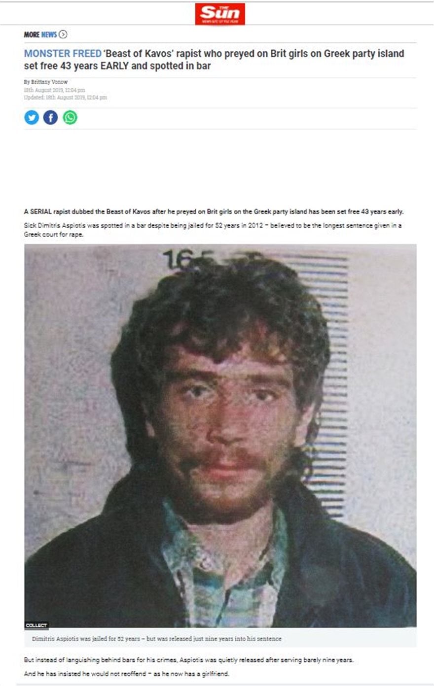 Όπως γράφουν η Express και η Sun, πρόκειται για τον Δημήτρη Ασπιώτη ο οποίος -το 2012- καταδικάστηκε στη μεγαλύτερη ποινή που είχε επιβληθεί μέχρι τότε σε βιαστή. Σύμφωνα με τα δημοσιεύματα, ο Ασπιώτης αφέθηκε ελεύθερος με τον περιοριστικό όρο της εμφάνισης την πρώτη ημέρα κάθε μήνα σε αστυνομικό τμήμα και της απαγόρευσης εξόδου από την Κέρκυρα.
