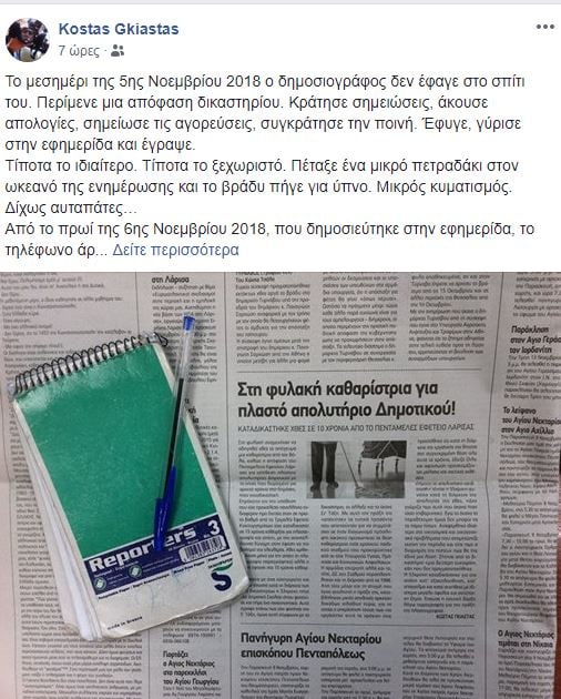 Ο δημοσιογράφος, Κώστας Γκιάστας, με ανάρτησή του στο Facebook, έγραψε χαρακτηριστικά: «Το μεσημέρι της 5ης Νοεμβρίου 2018 ο δημοσιογράφος δεν έφαγε στο σπίτι του. Περίμενε μια απόφαση δικαστηρίου. Κράτησε σημειώσεις, άκουσε απολογίες, σημείωσε τις αγορεύσεις, συγκράτησε την ποινή. Έφυγε, γύρισε στην εφημερίδα και έγραψε.