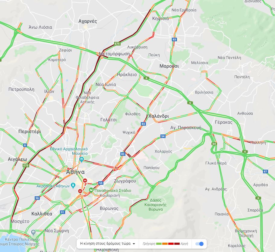 Όπως φαίνεται από τον χάρτη της Google τα έντονα προβλήματα στην κυκλοφορία εντοπίζονται από το ύψος της Κηφισιάς έως το Μοσχάτο, σε μια απόσταση περίπου 24 χιλιομέτρων.