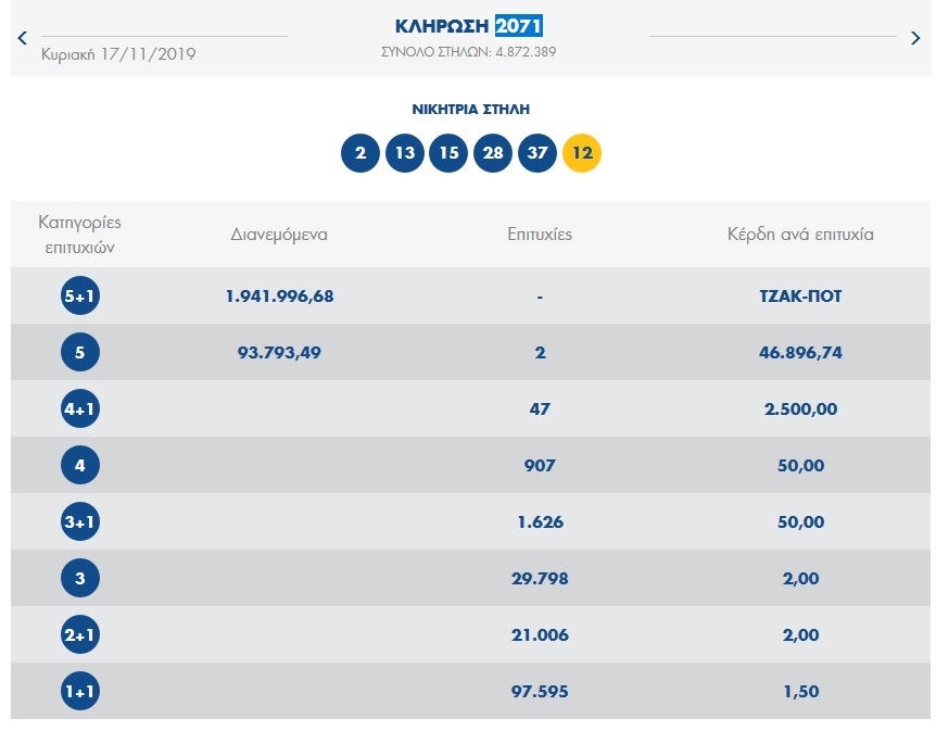 Πραγματοποιήθηκε η κλήρωση του Τζόκερ (2071) την Κυριακή, η οποία μοίραζε τουλάχιστον 1,9 εκατ. ευρώ στους τυχερούς της πρώτης κατηγορίας.
