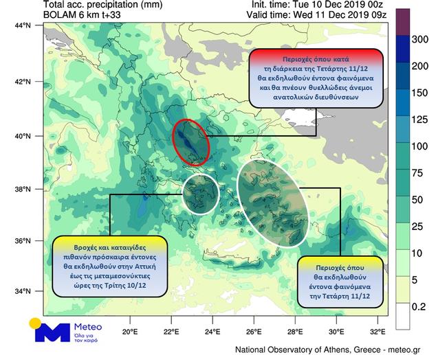 Παράλληλα, ισχυρές βροχοπτώσεις και καταιγίδες θα εκδηλωθούν κατά τη διάρκεια της νύχτας προς την Τετάρτη στην Πιερία, στην Ημαθία και στα παράκτια κυρίως τμήματα της Ανατολικής Θεσσαλίας. Λόγω του πολύ ενισχυμένου ανατολικού ρεύματος που θα πνέει στο Βόρειο Αιγαίο με εντάσεις οκτώ έως εννέα μποφόρ, τα φαινόμενα σε αυτές τις περιοχές θα συνεχιστούν κατά τόπους έως το απόγευμα της Τετάρτης.