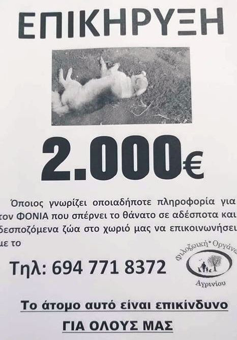 Σύμφωνα με την καταγγελία ο άγνωστος έχει σπείρει το θάνατο σε πολλά άτυχα σκυλιά της περιοχής, ενώ στην αφίσα αναφέρεται ότι «το άτομο αυτό είναι επικίνδυνο για όλους μας»🕛 χρόνος ανάγνωσης: 2 λεπτά ┋