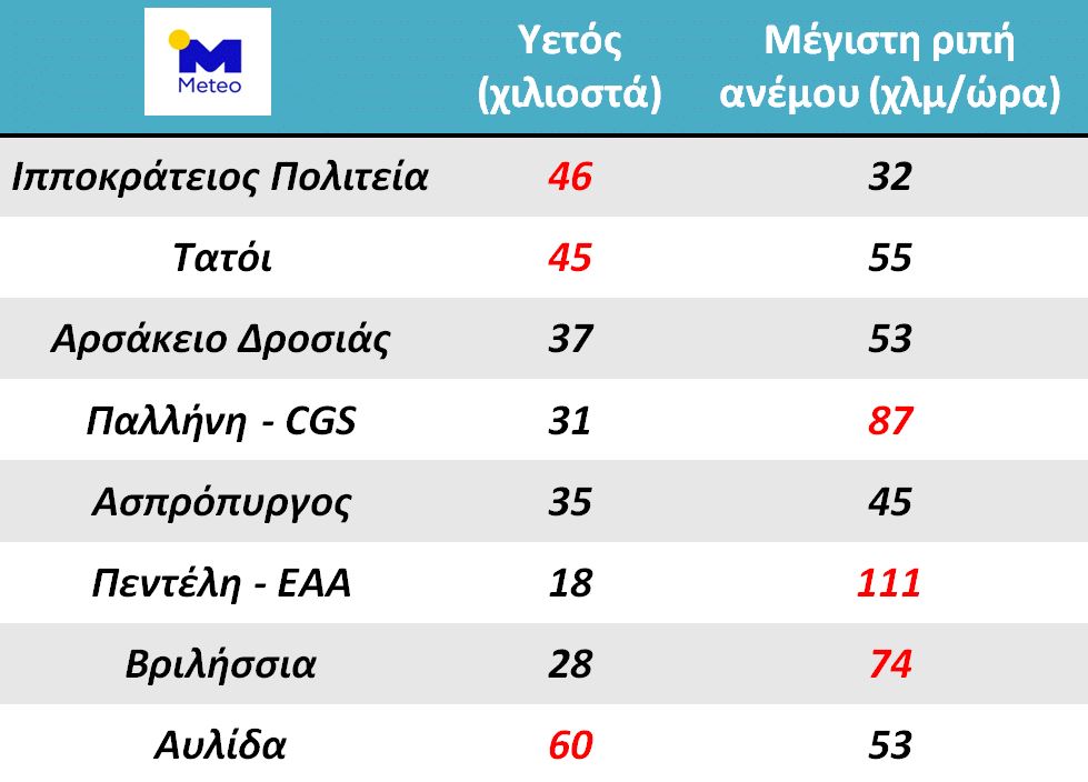 Αξίζει να σημειωθεί ότι στην Πεντέλη η μέγιστη ριπή που καταγράφηκε έφτασε τα 111 χλμ/ώρα. Στον πίνακα που ακολουθεί παρουσιάζονται τα ολικά ύψη υετού (βροχή / χιόνι) καθώς και οι μέγιστες ριπές ανέμου που καταγράφηκαν σε επιλεγμένους μετεωρολογικούς σταθμούς του δικτύου του Εθνικού Αστεροσκοπείου Αθηνών / meteo.gr.