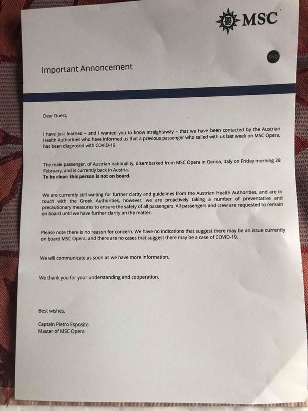 Οι επιβάτες δέχτηκαν μήνυμα το οποίο τους ανέφερε ότι έπρεπε να επιστρέψουν στο καράβι πίσω εξαιτίας ενός ζητήματος ασφαλείας. 'Όταν, όμως, έφτασαν εκεί, έμαθαν μέσα από επιστολή του καπετάνιου τι ακριβώς έχει συμβεί. Σε αυτήν ο καπετάνιος Pietro Esposito, παρουσιάζε τα δεδομένα για το κρούσμα κοροναϊού: ένας άνδρας, ο οποίος αποβιβάστηκε στη Γένοβα της Ιταλίας, την Παρασκευή 28/02 και πλέον βρίσκεται στην Αυστρία, διάγνωστηκε με κοροναϊό.