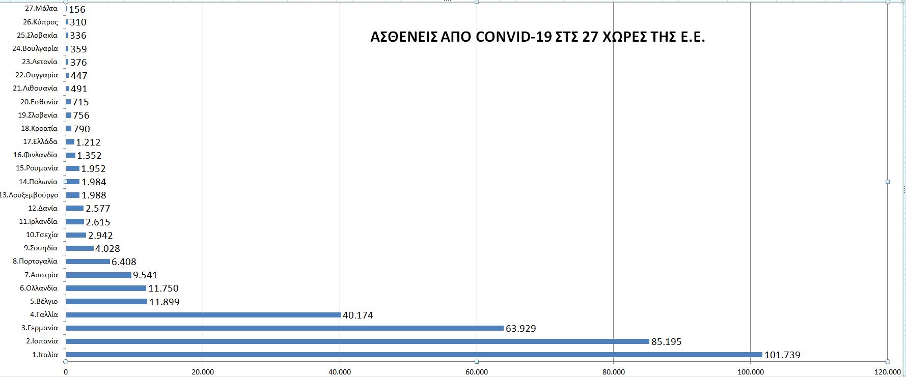 Στον πίνακα των συνολικών ασθενών μεταξύ των 27χωρών της Ευρωπαϊκής Ενωσης η Ελλάδα βρίσκεται στην 17η θέση με 1.212 κρούσματα του CONVID-19. Στην πρώτη θέση είναι η Ιταλία με 101.739 ασθενείς από κορονοϊό ενώ ακολουθεί η Ισπανία με 85.195 ξεπερνώντας μάλιστα και την Κίνα. Την τριάδα συμπληρώνει η Γερμανία με 63.929, ενώ στην τελευταία θέση είναι η Μάλτα με μόλις 156 κρούσματα. (πίνακας 3 - γράφημα 3).