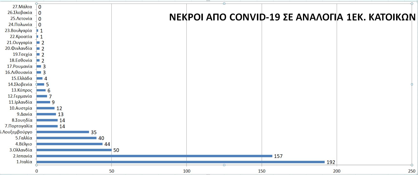 Εντυπωσιακός είναι και ο πίνακας με την αναλογία νεκρών ανά 1 εκ. κατοίκους. Η Ελλάδα βρίσκεται στην 15η θέση με 4 νεκρούς σε 1 εκατομμύριο κατοίκους. Σε αυτή τη λίστα την πρώτη θέση κατέχει η Ιταλία με 192 νεκρούς στο 1 εκ. κατοίκους με δεύτερη την Ισπανία 157 κατοίκους, ενώ την 4αδα συμπληρώνουν η Ολλανδία και το Βέλγιο με 50 και 44 νεκρούς αντίστοιχα ανά 1 εκ. κατοίκους. (γράφημα 2).