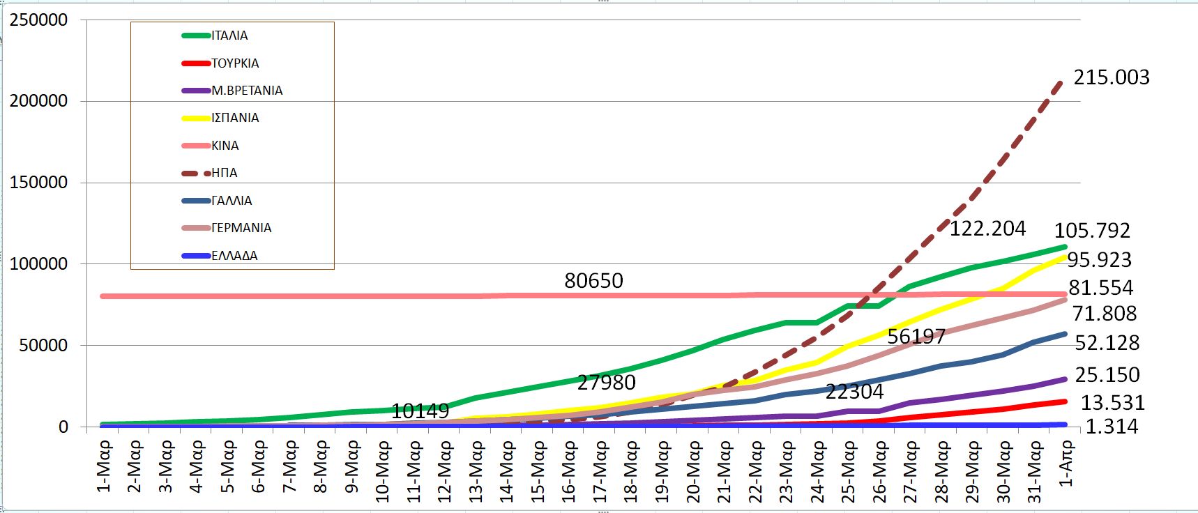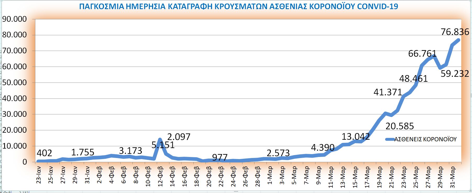 ΓΡΑΦΗΜΑ-2: Η ΠΑΓΚΟΣΜΙΑ ΗΜΕΡΗΣΙΑ ΚΑΤΑΓΡΑΦΗ ΚΡΟΥΣΜΑΤΩΝ ΑΣΘΕΝΩΝ CONVID-19 (ΜΕΧΡΙ ΚΑΙ 1 ΑΠΡΙΛΙΟΥ)
