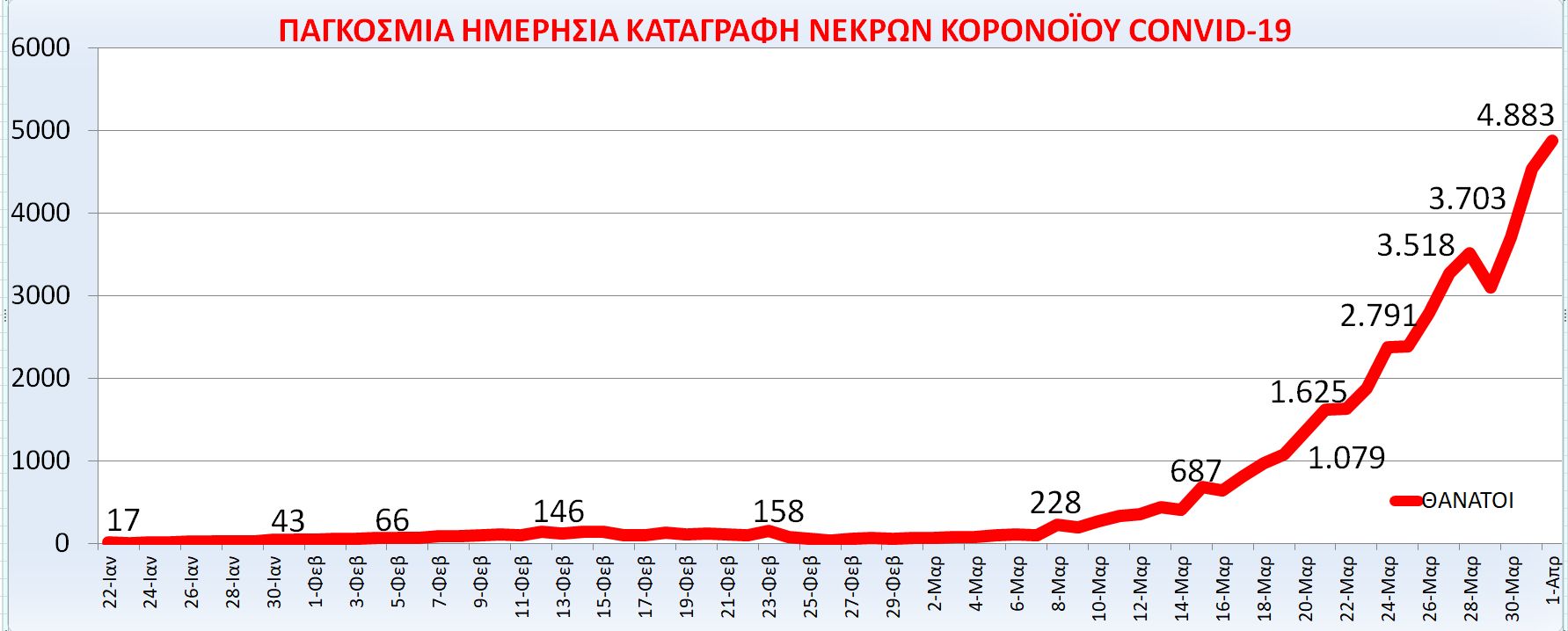 ΓΡΑΦΗΜΑ-3: Η ΠΑΓΚΟΣΜΙΑ ΗΜΕΡΗΣΙΑ ΚΑΤΑΓΡΑΦΗ ΝΕΚΡΩΝ ΑΠΟ CONVID-19 (ΜΕΧΡΙ ΚΑΙ 1 ΑΠΡΙΛΙΟΥ)