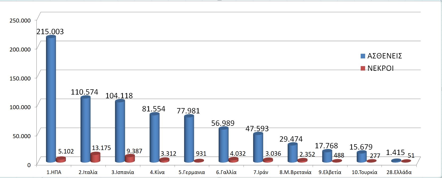 ΓΡΑΦΗΜΑ-1: ΟΙ ΠΡΩΤΕΣ 10 ΧΩΡΕΣ ΣΤΟΥΣ ΑΣΘΕΝΕΙΣ ΚΟΡΟΝΟΪΟΥ ΚΑΙ Η ΘΕΣΗ ΤΗΣ ΕΛΛΑΔΑΣ (ΜΕΧΡΙ ΚΑΙ 1 ΑΠΡΙΛΙΟΥ)