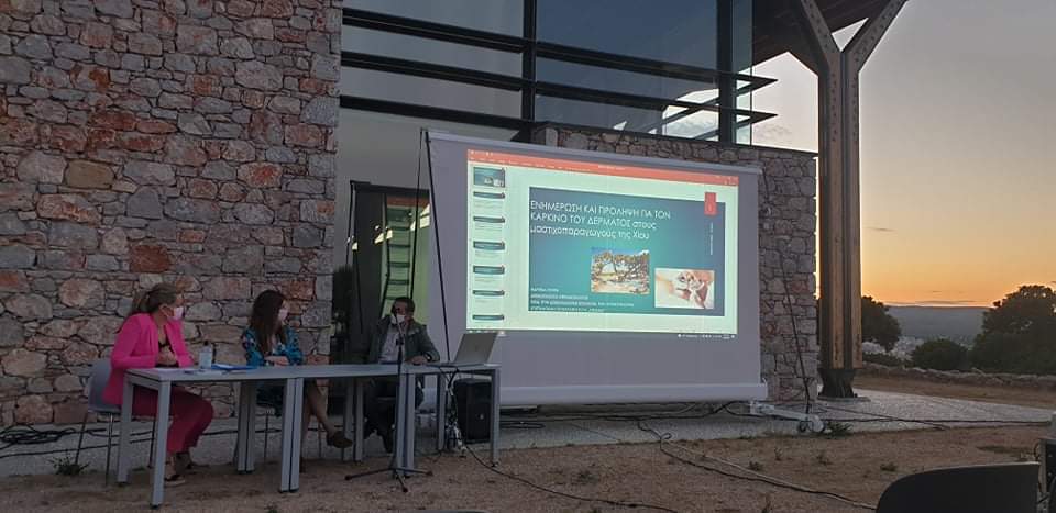 Παράλληλα θα θέλαμε να ευχαριστήσουμε την Ένωση Μαστιχοπαραγωγών Χίου για την υποστήριξή της, τον πρόεδρο της, κύριο Γεώργιο Τούμπο, τον αναπληρωτή διευθυντή, κύριο Ηλία Σμυρνιούδη, αλλά και όλους τους μαστιχοπαραγωγούς που συμμετείχαν ενεργά στη δράση. Είναι σημαντικό, ότι μας έδωσαν την άποψή τους και μας εξήγησαν το πόσο δύσκολη είναι η εργασία τους και πόσο σημαντικό είναι για αυτούς να ενημερώνονται για τόσο σημαντικά θέματα και ιδιαίτερα για το Μελάνωμα και τον Καρκίνο του Δέρματος. Είναι ένα θέμα που τους απασχολεί ιδιαίτερα, διότι εργάζονται για πάρα πολλές ώρες και για πολλούς μήνες στην ύπαιθρο, κάτω από τα σχοίνα και εκτίθενται έντονα στην ηλιακή ακτινοβολία.