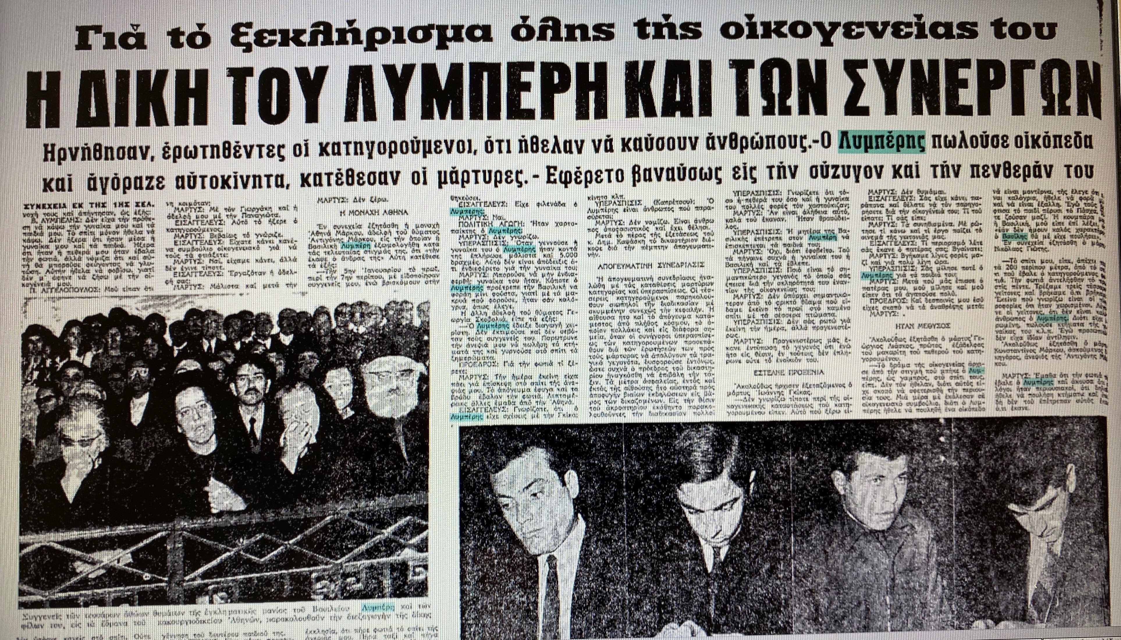 Στο δρόμο θα σταματήσουν για να προμηθευτούν σπίρτα. Ο Αγγελόπουλος δειλιάζει. Εκφράζει τον φόβο του μήπως εκτός από την πεθερά του Λυμπέρη, βρίσκονται στο σπίτι η γυναίκα και τα παιδιά του. “Με πήρε και με πήγε σε ένα περίπτερο και σήκωσε το τηλέφωνο η πεθερά του. Της λέει: “Θέλω να έρθω να δω τη γυναίκα μου και τα παιδιά μου”. Και του απαντάει: “Δεν είναι εδώ. Λείπουνε στο Πέραμα. Θα έρθουν μετά από πέντε μέρες. Και εγώ θα φύγω””, θα πει ο Αγγελόπουλος σε κάποια από τις καταθέσεις του αργότερα.