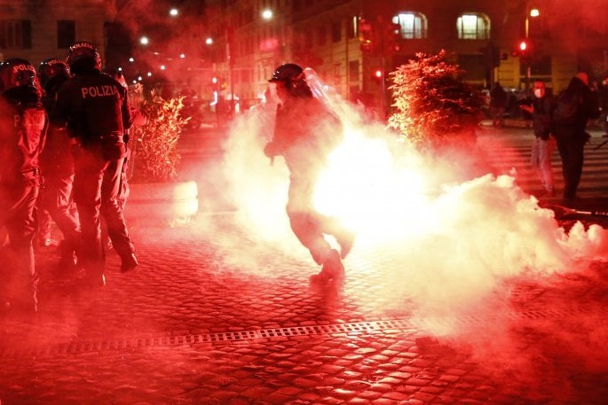 Κι όλα αυτά ενώ κλιμακώνεται το κύμα διαμαρτυριών κατά των περιοριστικών μέτρων. Οι διαδηλωτές στην κεντρική πλατεία Piazza del Popolo στη Ρώμη περίμεναν μέχρι ένα λεπτό πριν τα μεσάνυχτα για να πυροδοτήσουν πυροτεχνήματα στα χρώματα της ιταλικής σημαίας και φορώντας μάσκες να πετάξουν φωτοβολίδες και βαρελότα κατά των αστυνομικών.