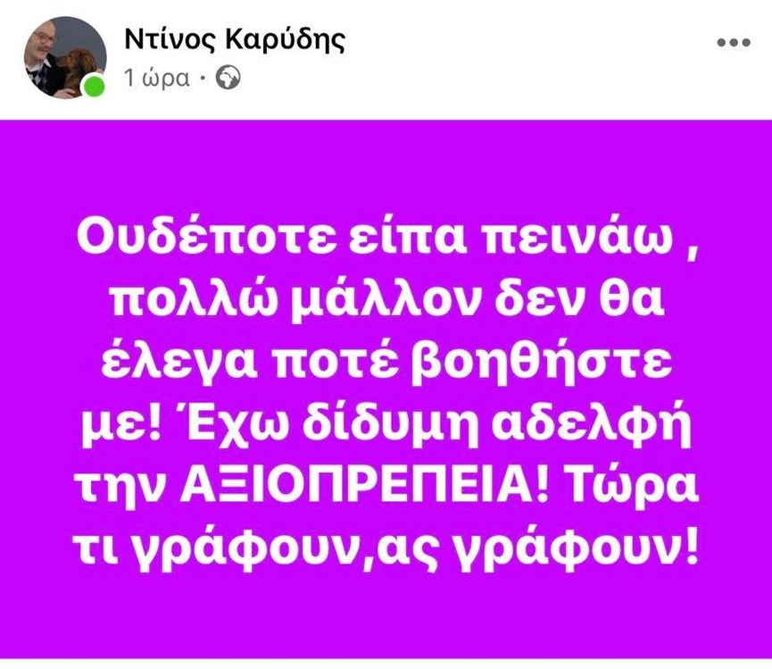 Με μία ανάρτηση στο προσωπικό του προφίλ στο Facebook, λοιπόν, ο Ντίνος Καρύδης ανέφερε: «Η Άννα Φόνσου έχει προσφέρει πολλά. Μακάρι να υπήρχαν κι’ άλλοι σαν την Άννα. Όταν ήμουν δημοτικός σύμβουλος, είχα πει ο δρόμος στο σπίτι του ηθοποιού να ονομαστεί οδός Άννας Φόνσου...όσο για την κόρη μου που αναφέρεστε αγαπημένοι συνέλληνες σας λέω Ναι μας συντηρεί και ντρέπομαι γι' αυτό, καλή Ανάσταση», ενώ λίγη ώρα αργότερα με μία δεύτερη ανάρτησή του ξεκαθάρισε: «Ουδέποτε είπα πεινάω, πολλώ μάλλον δεν θα έλεγα ποτέ βοηθήστε με! Έχω δίδυμη αδελφή την αξιοπρέπεια! Τώρα τι γράφουν, ας γράφουν».