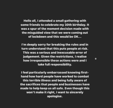 «Εκφράζω τη βαθιά λύπη μου επειδή παραβίασα τους κανόνες και με τη σειρά μου αντιλαμβάνομαι ότι αυτό έθεσε ανθρώπους σε κίνδυνο. Ήταν μια σοβαρή και αδικαιολόγητη λάθος κρίση. Δεδομένων των περιορισμών, συνειδητοποιώ πόσο ανεύθυνες ήταν αυτές οι ενέργειες και αναλαμβάνω πλήρως την ευθύνη».