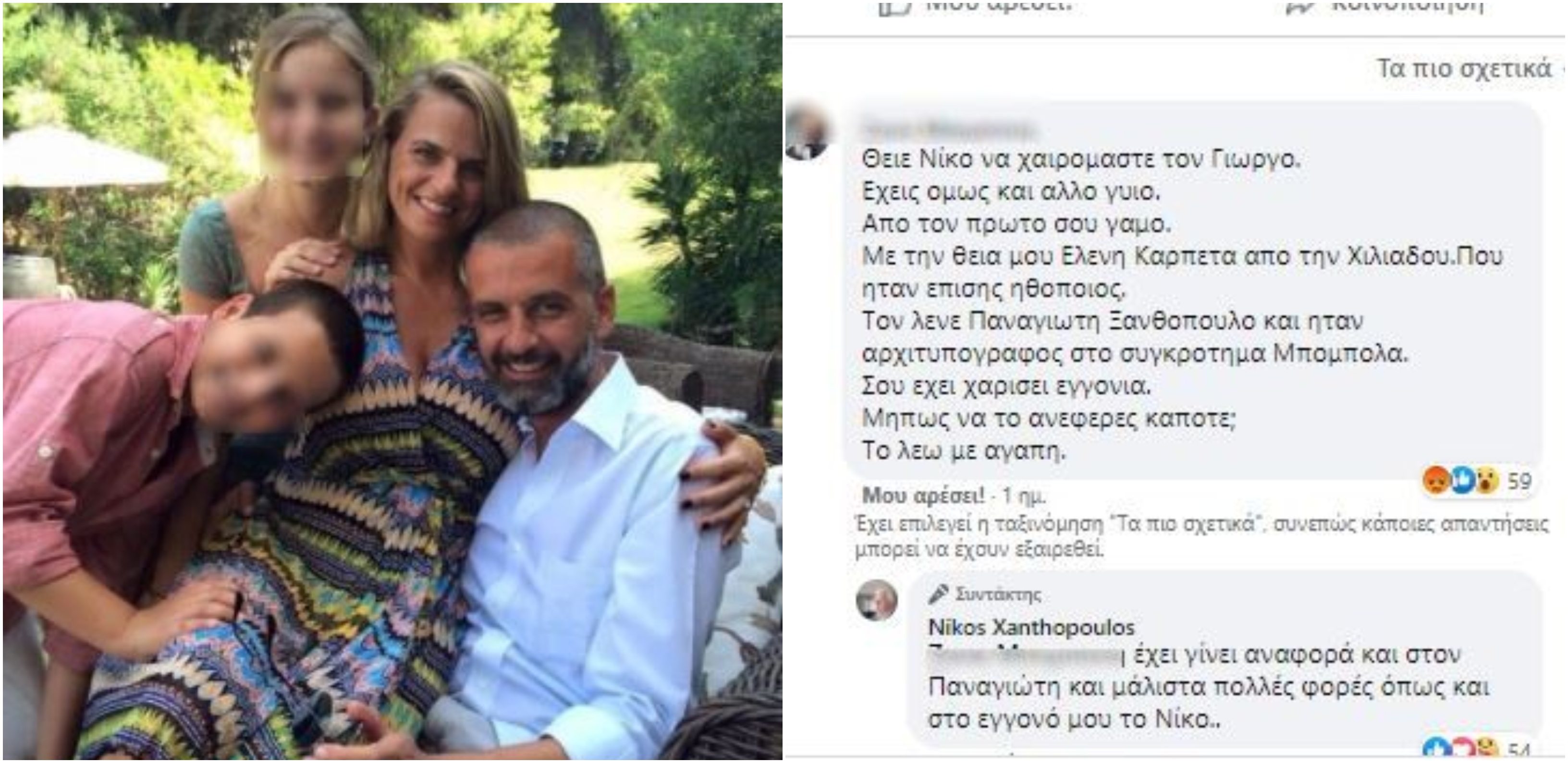 Κάτω από την ανάρτηση, όμως, σχολίασε η ανιψιά του, κάνοντας αναφορά στον δεύτερο γιο του, Παναγιώτη. «Θείε Νίκο να χαιρόμαστε τον Γιώργο. Έχεις όμως και άλλο γιο. Από τον πρώτο σου γάμο με τη θεία μου, Ελένη Καρπέτα από την Χιλιαδου, που ήταν επίσης ηθοποιός. Τον λένε Παναγιώτη Ξανθόπουλο και ήταν αρχιτυπογράφος στο συγκρότημα Μπόμπολα. Σου έχει χαρίσει εγγόνια. Μήπως να το ανέφερες κάποτε; Το λέω με αγάπη».