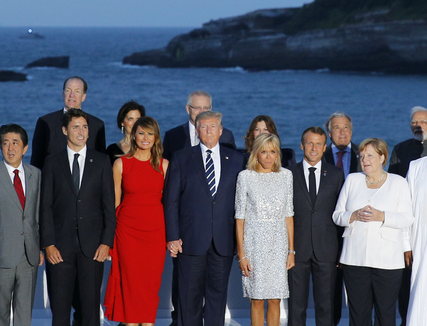Στο κέντρο της εικόνας βρίσκονταν ο οικοδεσπότης της εκδήλωσης, ο Γάλλος πρόεδρος Εμανουέλ Μακρόν, συνοδευόμενος από την σύζυγό του, Μπριζίτ. Στα δεξιά της Πρώτης Κυρίας της Γαλλίας βρισκόταν ο Ντόναλντ Τραμπ με την Μελάνια, ακολουθούμενη από τον Καναδό πρωθυπουργό Τζάστιν Τριντό και τον πρωθυπουργό της Ιαπωνίας Σίνζο Άμπε με την σύζυγό του. Από την άλλη πλευρά, δίπλα στον Μακρόν βρισκόταν η Άνγκελα Μέρκελ.