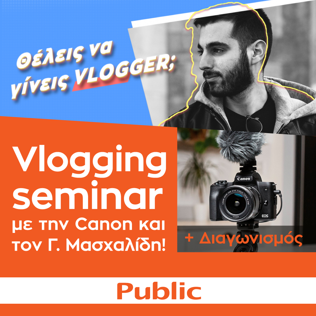 Το Public, Νο1 αλυσίδα τεχνολογίας και ψυχαγωγίας, σε συνεργασία με την Canon, την κορυφαία εταιρία φωτογραφικών μηχανών και τεχνολογιών απεικόνισης, διοργανώνουν έναν συναρπαστικό κύκλο διαδικτυακών σεμιναρίων vlogging για όσους θέλουν να γίνουν οι επόμενοι σταρ του διαδικτύου! Οι συμμετέχοντες θα έχουν τη δυνατότητα να μάθουν όλα τα μυστικά και τις τεχνικές λήψης για τέλεια βίντεο, από έναν από τους επίσημους φωτογράφους της Canon Greece, Γιώργο Μασχαλίδη.