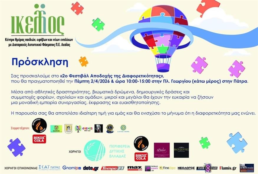 Με αφορμή την Παγκόσμια Ημέρα Αυτισμού, το Κέντρο Ημέρας παιδιών, εφήβων και νέων ενηλίκων με Διαταραχές Αυτιστικού Φάσματος Π.Ε. Αχαΐας του Σωματείου «ΙΚΕΛΟΣ» διοργανώνει δράση ενημέρωσης και ευαισθητοποίησης, 2ο Φεστιβάλ Αποδοχής της Διαφορετικότητας, την Πέμπτη 2 Απριλίου 2026 στην Πλατεία Γεωργίου (κάτω μέρος) στην Πάτρα & ώρα 10:00 έως 15:00.