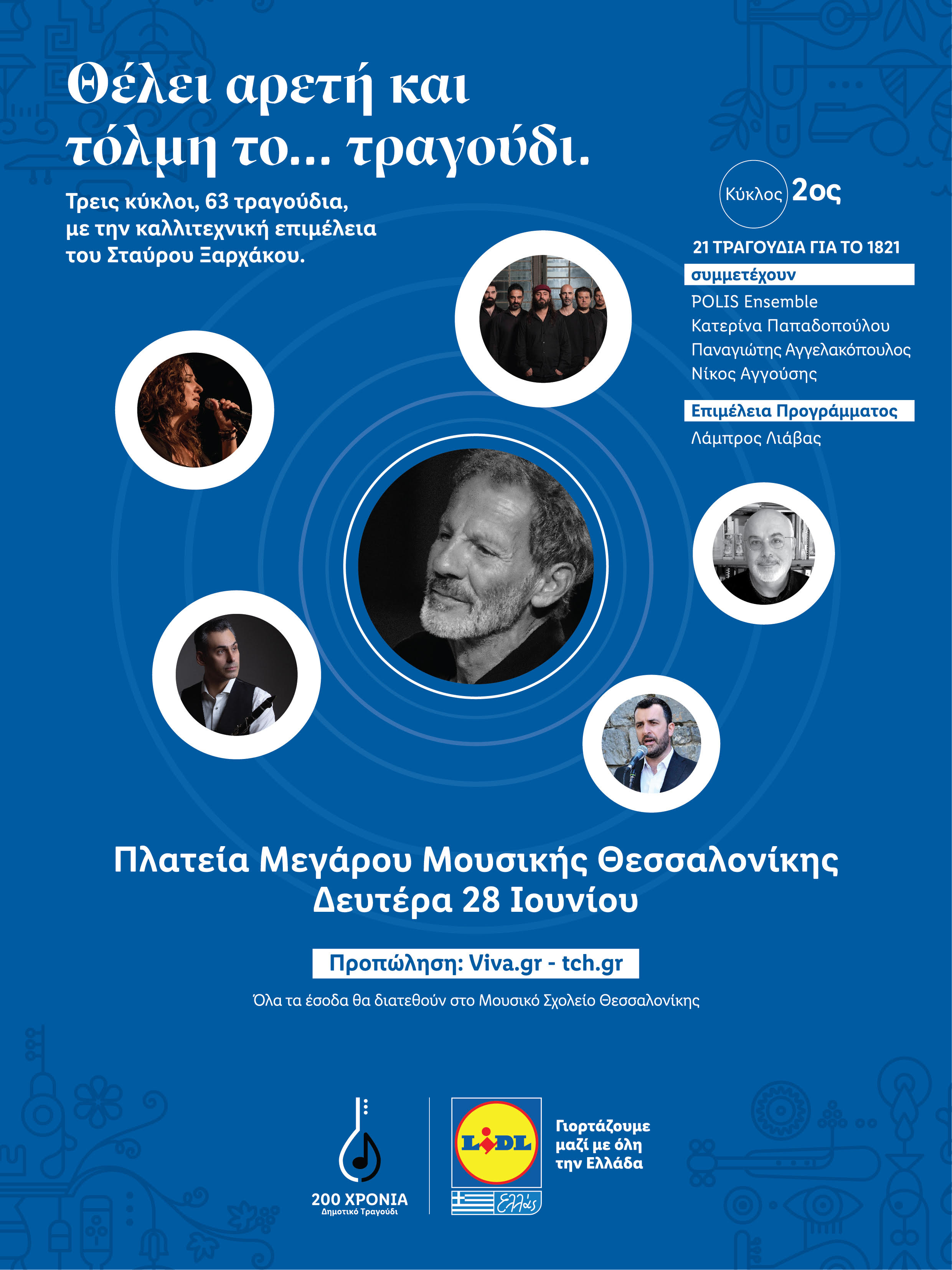 Στο πλαίσιο των εορτασμών για τα 200 χρόνια από την Εθνεγερσία, ο κορυφαίος Έλληνας συνθέτης και μαέστρος Σταύρος Ξαρχάκος, προτείνει ένα πολύπλευρο πρόγραμμα δράσεων που προβάλουν τη σημασία και τη διαχρονικότητα της ελληνικής μουσικής παράδοσης. Πρόκειται για τρεις μουσικούς κύκλους που ο καθένας περιέχει συμβολικά 21 τραγούδια με σημείο αναφοράς την παράδοση του δημοτικού μας τραγουδιού. Ιδιαίτερη έμφαση δίνεται στη δυναμική της μουσικής παράδοσης σε σχέση με το σήμερα, επιβεβαιώνοντας ότι το βαθύτερο ύφος και ήθος αυτών των τραγουδιών εξακολουθεί να μας αφορά και να εμπνέει τη σύγχρονη μουσική εκτέλεση και δημιουργία!