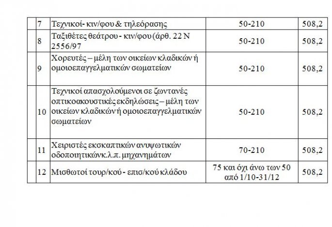 Οικοδόμοι, λατόμοι, ασβεστοποιοί, πλινθοποιοί, αγγειοπλάστες, δασεργάτες, ρητινοσυλλέκτες, καπνεργάτες, μουσικοί μέλη των οικείων επαγγελματικών σωματείων, υποδηματεργάτες, μισθωτοί ναυπηγοεπισκευαστικής ζώνης, χειριστές εκσκαπτικών-ανυψωτικών-οδοποιητικών-γεωτρητικών μηχανημάτων, ηθοποιοί, τεχνικοί κινηματογράφου και τηλεόρασης, ταξιθέτες θεάτρου – κινηματογράφου, χειριστές και βοηθοί χειριστών κινηματογράφου, ελεγκτές κινηματογράφου και θεάτρου, ταμίες κινηματογράφου και θεάτρου, μισθωτοί τουριστικού και επισιτιστικού κλάδου και σμυριδεργάτες. χορευτές - μέλη των οικείων κλαδικών ή ομοιοεπαγγελματικών σωματείων, καθώς και των τεχνικών απασχολούμενών σε ζωντανές οπτικοακουστικές εκδηλώσεις - μέλη των οικείων κλαδικών ή ομοιοεπαγγελματικών σωματείων