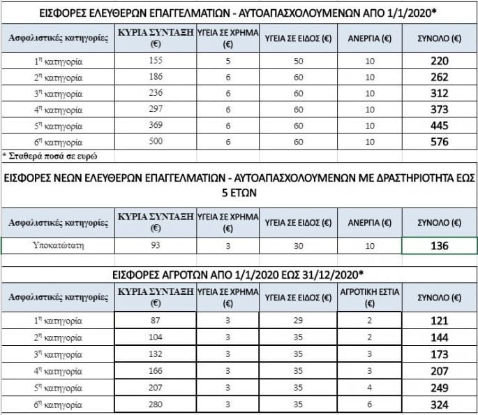 Σύμφωνα με τα άρθρα 35, 36 και 37 που αντικαθιστούν τα άρθρα 39, 40 και 41 αντίστοιχα του νόμου Κατρούγκαλου, όλοι οι αυτοτελώς απασχολούμενοι, ελεύθεροι επαγγελματίες (πρ. ΟΑΕΕ και ΕΤΑΑ) και αγρότες (πρ. ΟΓΑ) εντάσσονται από 1/1/2020 σε 6 κατηγορίες, με σταθερά ποσά μηνιαίων εισφορών κύριας σύνταξης και υγείας. Οι ασφαλισμένοι κατατάσσονται με ελεύθερη επιλογή τους σε μία από τις 6 κατηγορίες. Αν ο ασφαλισμένος δεν επιλέξει κατηγορία με αίτησή του, κατατάσσεται υποχρεωτικά στην πρώτη και ελάχιστη των 220 ευρώ το μήνα για τους επαγγελματίες και 121 για τους αγρότες. Για τους αγρότες διατηρείται η μεταβατική περίοδος και οι εισφορές κλάδου σύνταξης αυξάνονται από 2 έως 8 ευρώ το 2021 και το 2022.