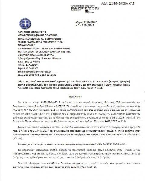 Την ώρα που τα γυρίσματα της ταινίας του Κώστα Γαβρά «Adults in a Room» βρίσκονται σε εξέλιξη, δημοσιεύθηκε στη Διαύγεια η απόφαση του υπουργού Ψηφιακής Πολιτικής Νίκου Παππά με βάση την οποία υπογράφηκε επιχορήγηση σχεδόν 629.561 ευρώ.