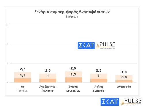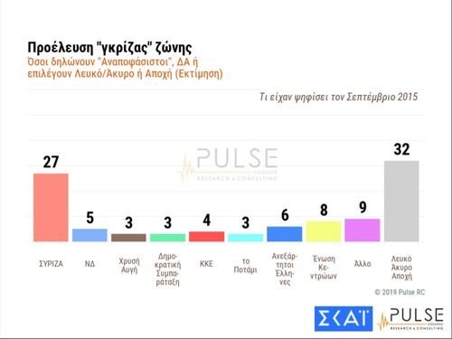 Η αδιευκρίνιστη ψήφος καταγράφεται σε χαμηλά επίπεδα στο 7,5% ενώ μαζί με όσους δηλώνουν λευκό/άκυρο/αποχή που είναι στο 3% και χαρακτηρίζονται ως «γκρίζα ζώνη», με το 27% να δηλώνει ότι είχαν ψηφίσει τον ΣΥΡΙΖΑ, το 5% ΝΔ, 1% ΧΑ, 3% Δημοκρατική Συμπαράταξη,4% ΚΚΕ, 3% Ποτάμι,6% ΑΝΕΛ, 8 % Ένωση Κεντρώων, 9% άλλο και 34% Λευκό/άκυρο αποχή.