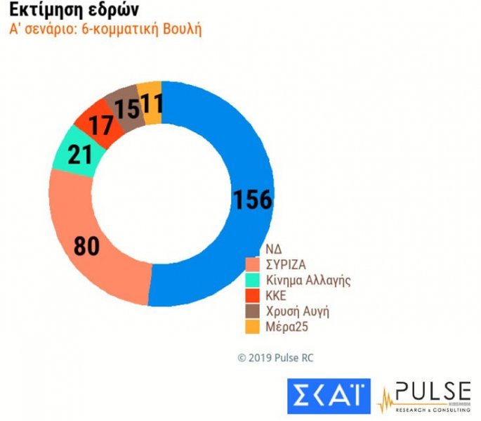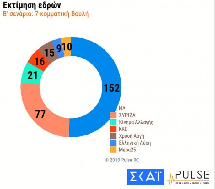 Το πρώτο σενάριο προβλέπει επτακομματική Βουλή με πρώτη τη ΝΔ και 151 έδρες. Ακολουθεί ο ΣΥΡΙΖΑ με 74 έδρες, το Κίνημα Αλλαγής με 23 έδρες, το ΚΚΕ με 16 έδρες, η Χρυσή Αυγή με 15 έδρες, η Ελληνική Λύση με 12 έδρες και η Μέρα 25 με 9 έδρες.