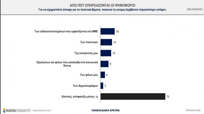 Επιπλέον το 16% λαμβάνει περισσότερο υπόψιν τη γνώμη των ειδικών/επιστημόνων που εμφανίζονται στα ΜΜΕ, το 13% των πολιτικών, το 12% λαμβάνει υπόψιν τη γνώμη της οικογένειάς τους, το 9% ακούει αυτούς που ακολουθεί στα social media, το 5% ακούει τους φίλους του, το 3% λαμβάνει υπόψιν τους δημοσιογράφους. Στον αντίποδα το 73% απαντάει ότι αποφασίζει μόνος/η του.