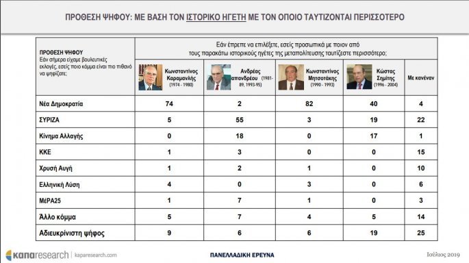 Επιπλέον προκύπτουν ενδιαφέροντα στοιχεία για την ταύτιση με τους ιστορικούς ηγέτες της Μεταπολίτευσης και για την πρόθεση ψήφου με βάση την κοινωνική τάξη που ανήκουν
