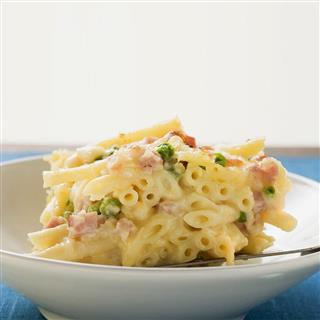 Οικογενειακό τραπέζι - Ζυμαρικά ογκρατέν με τυρί, μπέικον και αρακά