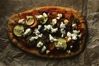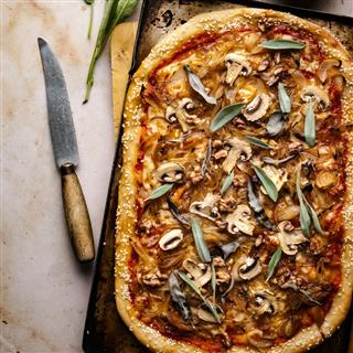 Vegetarian πίτσα με καραμελωμένα κρεμμύδια, μανιτάρια και καρύδια