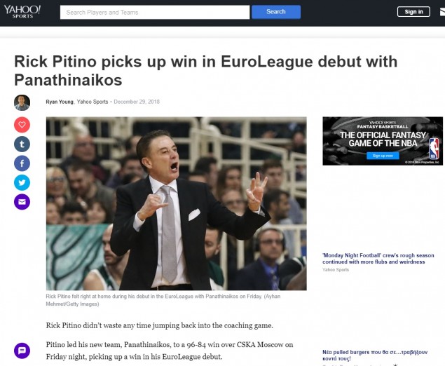 Το νικηφόρο ντεμπούτο του Ρικ Πιτίνο στον πάγκο του Παναθηναικού έγινε θέμα στα αμερικανικά ΜΜΕ.