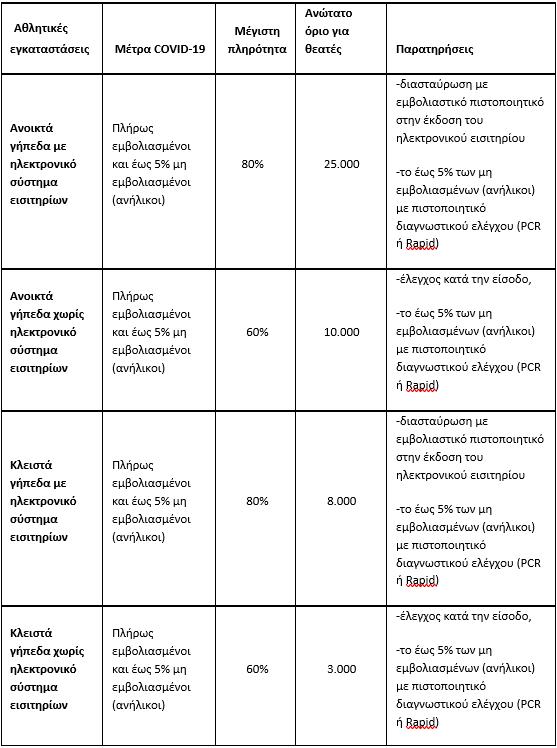 - Παράλληλα, απευθύνεται ισχυρή σύσταση προς τις ΠΑΕ, τα αθλητικά σωματεία και τα ΜΜΕ να απασχολούν στους αθλητικούς χώρους εμβολιασμένους επαγγελματίες. Οι εργαζόμενοι στους αθλητικούς χώρους που δεν θα είναι εμβολιασμένοι, πρέπει να έχουν υποβληθεί σε υποχρεωτικό PCR (48 ωρών) ή rapid test (24 ωρών) πριν από την έναρξη του εκάστοτε αγώνα.