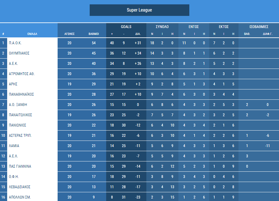 Βαθμολογία Super League: Στο +9 ο ΠΑΟΚ από τον Ολυμπιακό