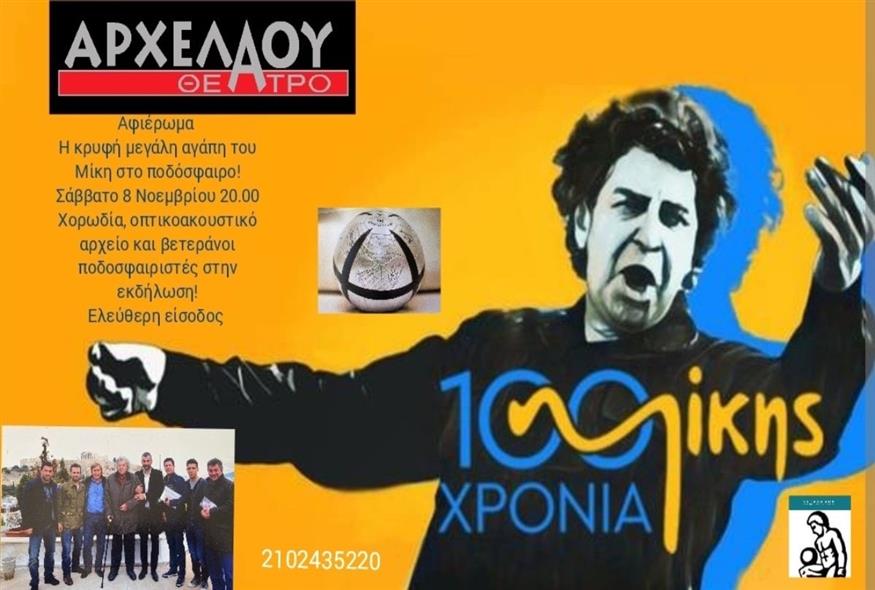 Ο Μίκης Θεοδωράκης αγαπούσε το ποδόσφαιρο. Δεν είναι ευρέως γνωστό αλλά η μπάλα ήταν ένα μεγάλο πάθος του. Με αφορμή τα 100 χρόνια από τη γέννηση του σπουδαίου συνθέτη το Αρχελάου θέατρο και το ΕΠΙΣΚΥΡΟΝ (Πανελλαδική Πρωτοβουλία Φιλάθλων), διοργανώνουν το Σάββατο 8 Νοεμβρίου στις 20.00, εκδήλωση με θέμα: «Η κρυφή μεγάλη αγάπη του Μίκη Θεοδωράκη για το ποδόσφαιρο».