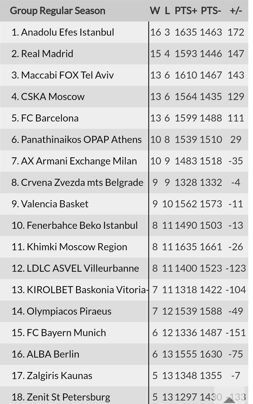 Αυτή την Εφές ποιος θα την σταματήσει; Η ομάδα του Εργκίν Αταμάν είχε ένα σχετικά εύκολο βράδυ απέναντι στην Αρμάνι. Επικράτησε με 88-68 στην έδρα της ανεβαίνοντας στις 16 νίκες. Η Εφές μετά την ήττα της Ρεάλ από την ΤΣΣΚΑ βρίσκεται μόνη της στην πρώτη θέση της βαθμολογίας. Για τους γηπεδούχους ο Λάρκιν ήταν ξανά ο κορυφαίος με 23 πόντους ενώ οι ξεχώρισαν επίσης οι Σίνγκλετον (16π.) και Σανλί(13π.).