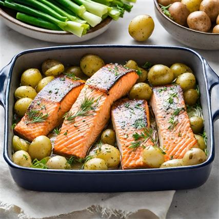 Ο σολομός γίνεται εύκολα, είναι υγιεινός και φουλ σε καλά λιπαρά, ενώ μαζί με τις baby πατάτες μετατρέπεται σε πεντανόστιμο και πολύ χορταστικό πιάτο.