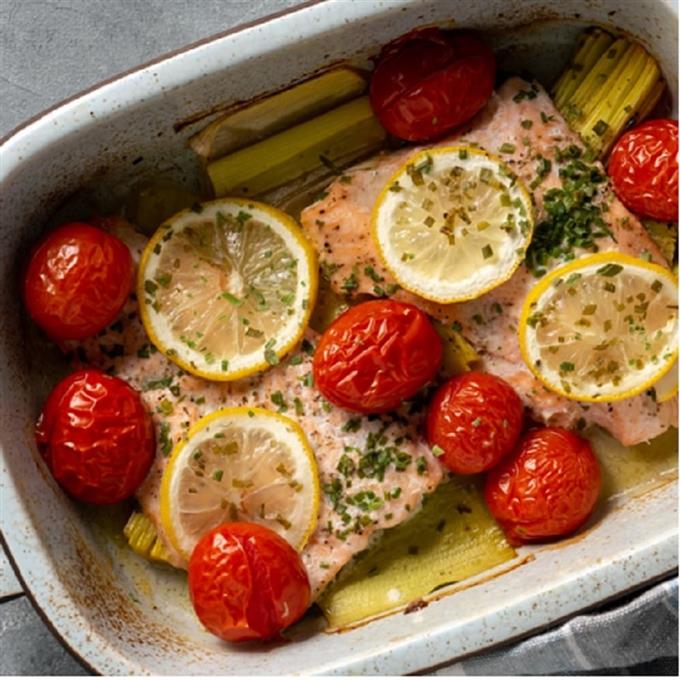 Για απόλυτα ισορροπημένο γεύμα, σερβίρετε το σολομό με καστανό ρύζι ατμού ή ρίξτε μερικές πατατούλες με τη φλούδα στο ταψί.